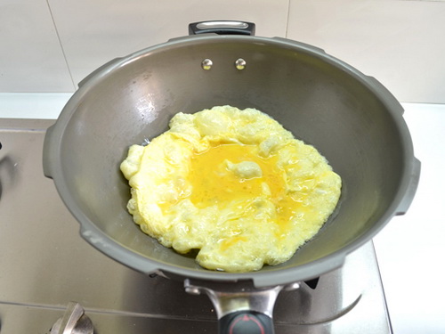 ![]() 4.Налить в сковороду взболтанные яйца и жарить на масле на маленьком огне пока масса не затвердеет.