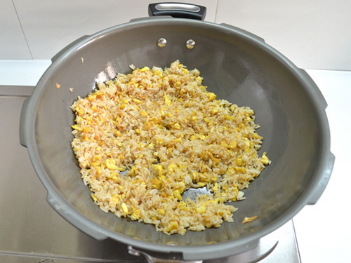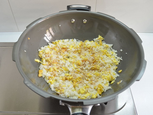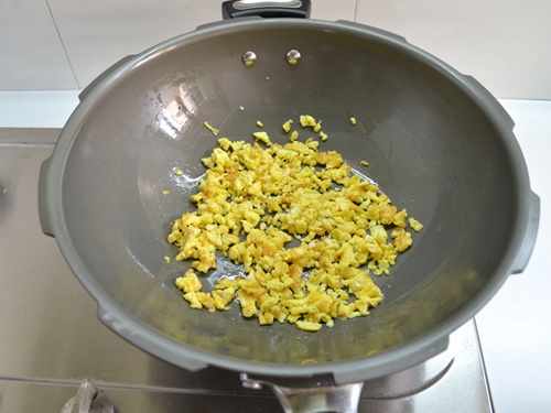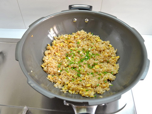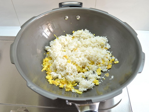 ![]() 6.Положить готовый рис и обжарить на среднем огне помещивая в течение 5 минут, чтобы рисовые зернышки разделились.