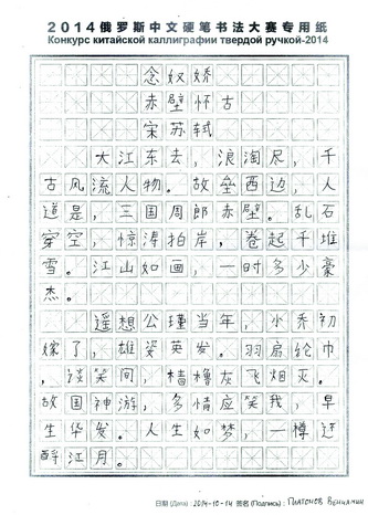 В. В. Платонов: При написании стихотворения 《念奴娇•赤壁怀古》я чувствовал глубокий смысл каждого написанного мною иероглифа. Я предварительно просмотрел каллиграфическое написание этого стихотворения.