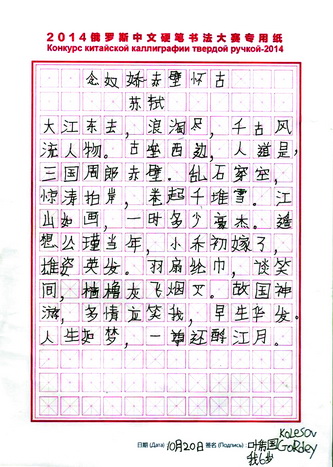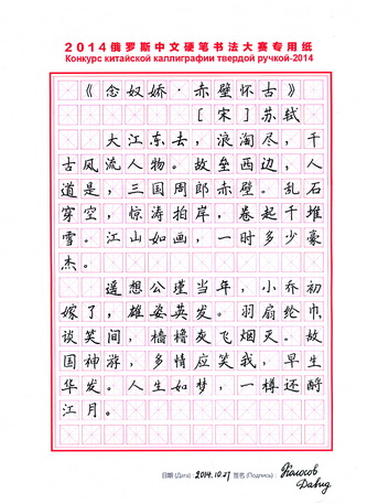 «Китай»: Что Вы чувствовали при написании стихотворения 《念奴娇 •赤壁怀古》? Как Вы готовились для участия в конкурсе?