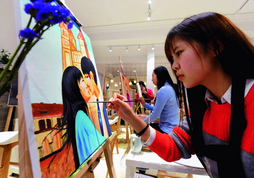 Этот клуб расположен в восточной части 4-го транспортного кольца Пекина, он называется «Leaderclub». В выходные за окнами клуба постоянно слышен типичный для городских районов шум снующих туда-сюда автомобилей, а в клубе – тихая студия, звучит приглушенная музыка. Представители разных профессий собираются здесь в свободное время, чтобы копировать масляную живопись Ван Гога. Большинство из них не владеет основами живописи, но они, несмотря на большую занятость, с удовольствием готовы выкроить половину дня, чтобы наслаждаться радостью цвета. Найти интересное кафе, имеющее необычный колорит, по настроению копировать масляную живопись – в последнее время этот вид досуга стал очень популярен среди белых воротничков во многих крупных городах Китая. Сотрудник Douban (интерактивный веб-сайт, в основном пользуется популярностью у белых воротничков и образованной молодежи) сказал, что на странице сайта Douban с начала 2010 года открылся курс масляной живописи с нуля, с 2013 по 2014 гг. на сайте Douban такие мероприятия проводились все чаще. Преимущественный выбор – масляная живопись Студия «Сэньхуэйгуань» расположена в Шанхае, здесь каждый раз по выходным проводится урок масляной живописи, цена за урок – 240 юаней. От других таких же занятий его отличает то, что здесь в первую очередь обращается внимание на чувство свободы и раскованности. Участникам не нужно приносить с собой ничего, студия предоставляет все необходимые материалы для рисования, в том числе бумагу, кисти, краски и т. д, участникам также не обязательно иметь соответствующую специальность или опыт художника. Здесь обсуждают не то, хорошо или плохо вы рисуете, или как следует рисовать, здесь самое главное – свобода самовыражения, каждый участник рисует так, как он хочет рисовать. На первом занятии преподаватель Цинь Янь сначала проанализировала со студентами произведение, которое они потом будут копировать. Поскольку у участников курсов не было почти никакого опыта рисования, а им сразу же пришлось иметь дело с шедеврами, преподаватель знакомила слушателей с основами живописного творчества простым доступным языком. «Раньше все считали, что в рисовании главное – это сходство с оригиналом, поэтому надо начинать с основ, и начинали обучение с наброска. Но после посещения многочисленных выставок живописи, люди стали более широко смотреть на цели искусства, они поняли, что их произведение не обязательно должно быть похоже на оригинал, достаточно бывает выразить свои чувства и настроения», – объяснила Цинь Янь. Не имея никакого опыта в живописи маслом, сразу пытаться начать рисовать, было бы слишком поспешным и необдуманным шагом. Однако же, в отличие от тех, кто стремится получить систематическое образование в этой области, чтобы участвовать в экзаменах и получить известность, целью белых воротничков является желание снять напряжение. Это стремление обрести радостное душевное состояние позволяет им найти наиболее подходящий для себя вид живописи. После первого занятия многие с удивлением узнали, что они также могут более – менее сносно скопировать подобное произведение. Вовсе не потому, что картина сама по себе простая, или у художника большой талант, а потому что курсы позволили выявить способности каждого. Например, при выборе работ для копирования, преподаватели отдают предпо