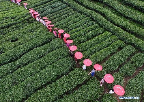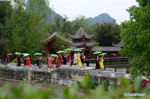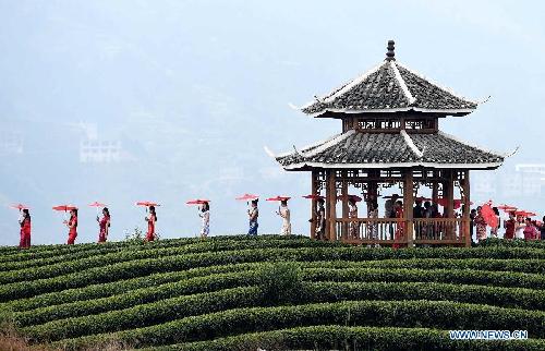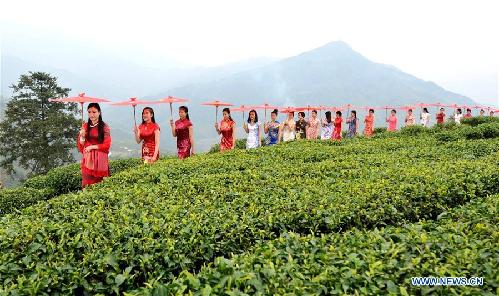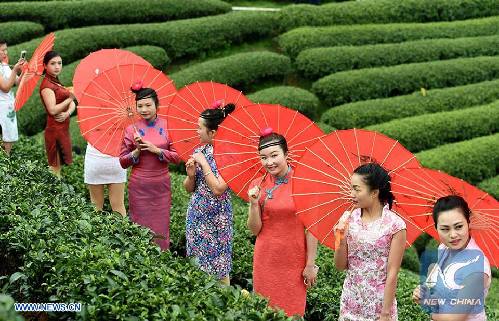 Показ традиционных китайских платьев ципао на фоне чайных плантаций Гуанси-Чжуанского автономного районе на юге Китая. (Синьхуа)