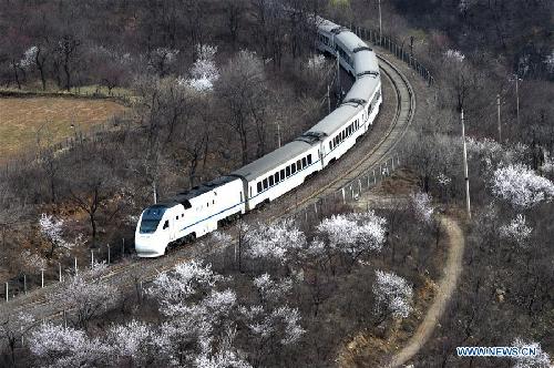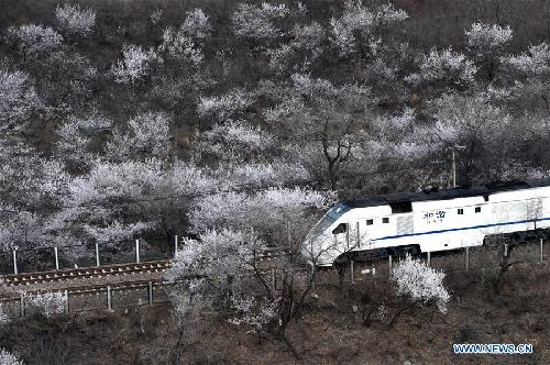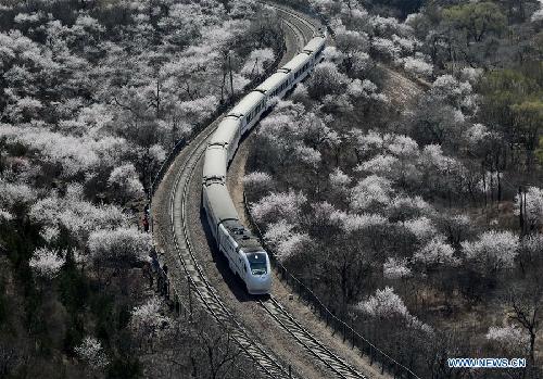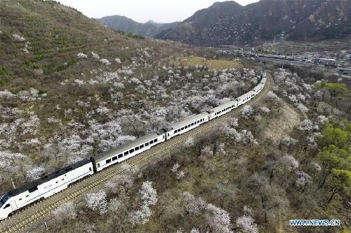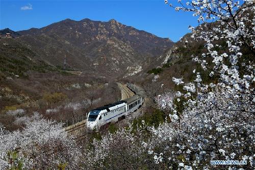 Поезда среди горных склонов вблизи заставы Цзюйюнгуань Великой китайской стены. (Синьхуа)