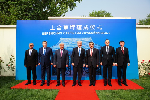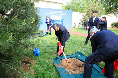 Шесть величественных сосен, символизирующих неувядающую дружбу народов шести стран, стойкость и созидательную силу совместного развития государств-членов ШОС, стали композиционной основой церемонии открытия «Лужайки ШОС», которая состоялась 29 апреля 2016 года в Штаб-квартире ШОС в Пекине.