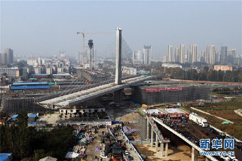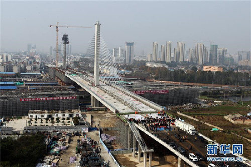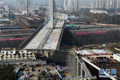 ![]() 8 ноября на улице Даньян города Хэцзэ провинции Шаньдун при помощи двух 350-тонных домкратов, мост весом 24,8 тыс. тонн был повернут на 81,67 градусов против часовой стрелки, была произведена стыковка с подходами к мосту. Так самый тяжелый мост в мире был успешно "повернут". Протяженность развязки на улице Даньян - 2031 м., она пролегает через две железнодорожные линии и грузовой склад. Чтобы уменьшить помехи для железных дорог, обеспечить безопасность прохождения, строительный отдел использовал технику «вращение после строения»: сначала мост строился параллельно к железной дороге, а затем был повернут до проектируемого места. (Синьхуа)