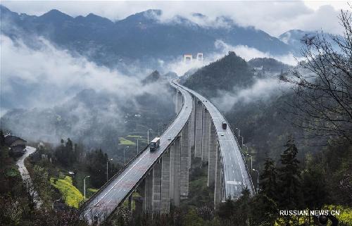4 апреля -- На фото -- окутанный туманной дымкой мост Сидухэ на участке скоростной автомагистрали Шанхай -- Чунцин в Эньши-Туцзя-Мяоском автономном округе провинции Хубэй /Центральный Китай/. (Синьхуа)